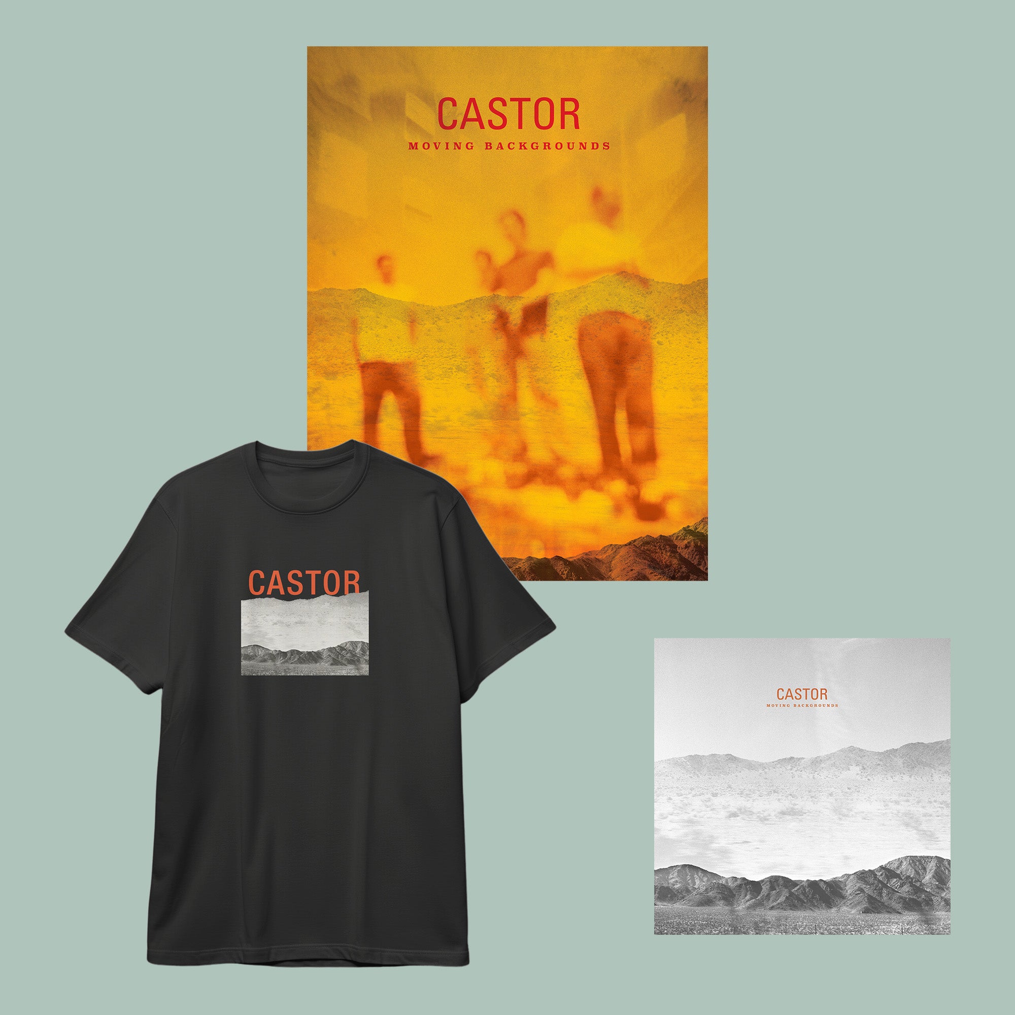 Bundle includes Moving Backgrounds vinyl, t-shirt, and poster.